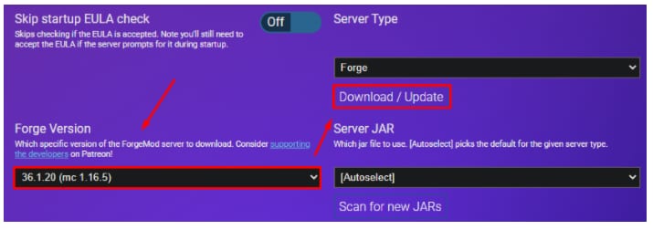 Choisissez Configuration et ouvrez Paramètres du serveur. Repérez le Type de serveur, choisissez Forge dans la liste déroulante, sélectionnez la version de Forge nécessaire (en fonction des mods/modpack), puis cliquez sur Télécharger/Mettre à jour :