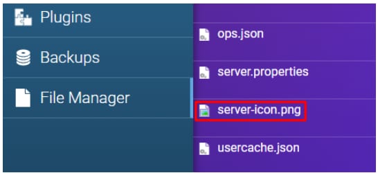 L’icône du serveur est une image au format PNG, qui doit respecter la limite de taille de 64×64 pixels. Vous devez la nommer server-icon.png et la télécharger sur votre serveur :