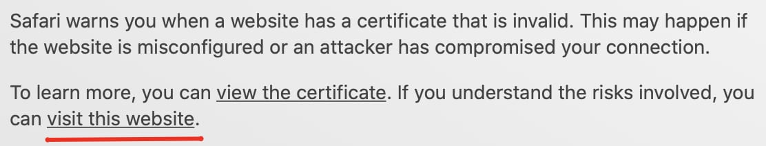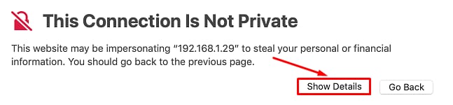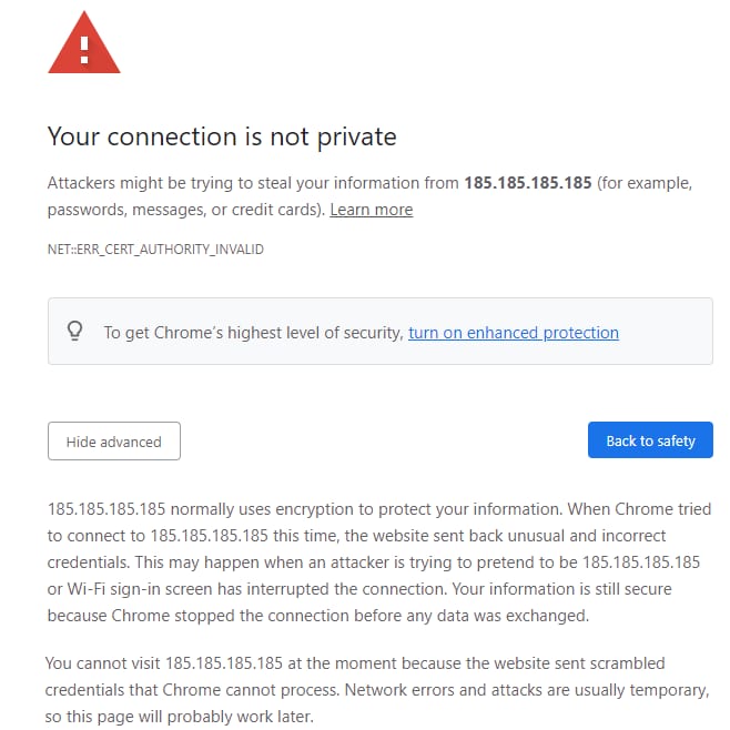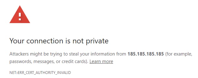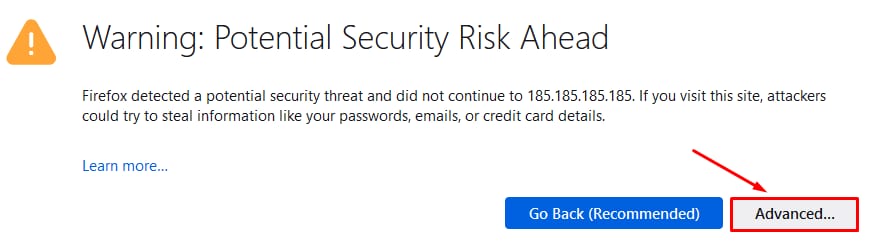 En dessous du message d’erreur, cliquez sur Advanced et sélectionnez Proceed to [your-vps-ip] (unsafe). Au cas où vous ne verriez pas le bouton “Proceed” :