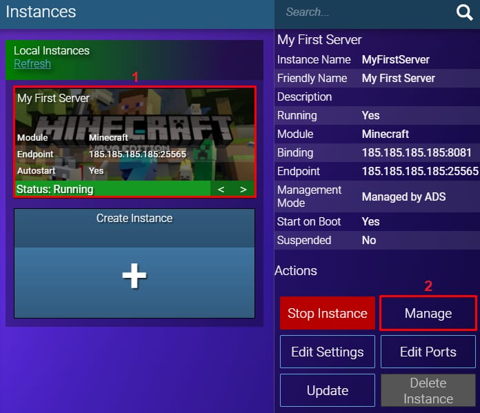 Afin d’attribuer plus de RAM à votre serveur Minecraft, sélectionnez d’abord votre instance et cliquez sur Gérer :
