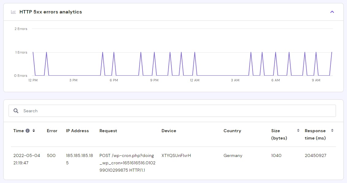Dans cette zone, un graphique montrera toutes les erreurs 5xx générées pour la période sélectionnée, ainsi qu’une description détaillée qui facilitera le dépannage :