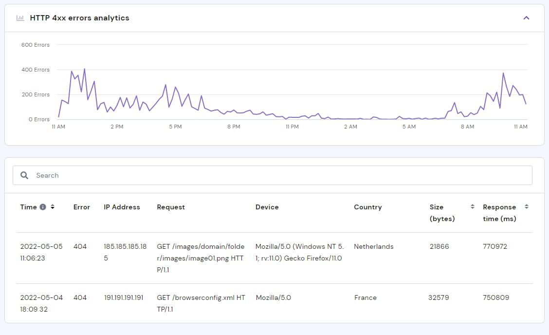 Vous trouverez ici toutes les erreurs 4xx générées pour la période sélectionnée, avec une description détaillée permettant d’identifier la cause profonde :