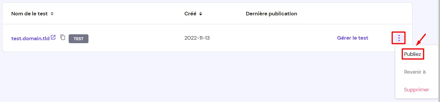 Vous serez dirigé vers le tableau de bord WordPress du site de test. Une fois que vous avez travaillé dessus et que vous êtes prêt à le mettre en ligne, vous pouvez pousser les changements en retournant dans la section Test et en cliquant sur le bouton d’options (⋮) → Publier :