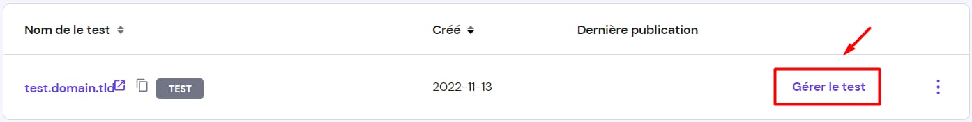 Pour accéder à votre site de test, allez dans la section Testage de votre hPanel et cliquez sur Gérer le test :