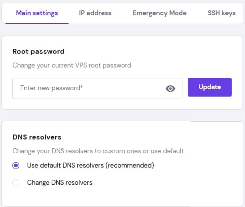 Dans cette section, vous pouvez facilement réinitialiser votre mot de passe root ainsi que changer les résolveurs DNS :