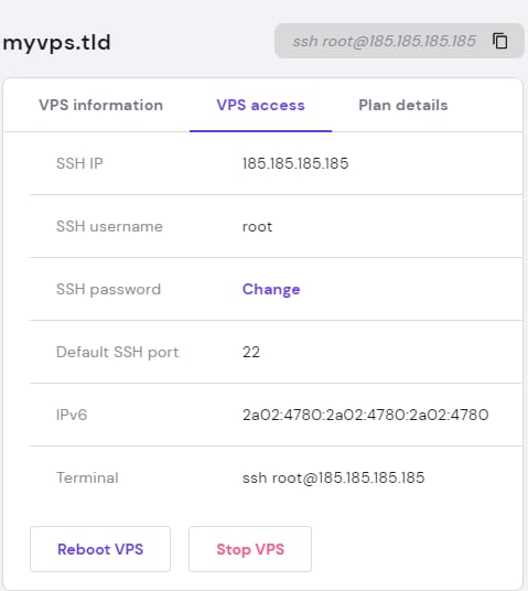 Il s’agit d’une section où vous pouvez trouver toutes les informations pour vous connecter à votre VPS via SSH :