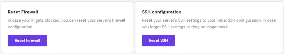 Si vous faites défiler la page vers le bas, vous verrez des boutons pour réinitialiser le pare-feu ou le SSH, ces options vous aideront si vous êtes bloqué dans votre VPS :