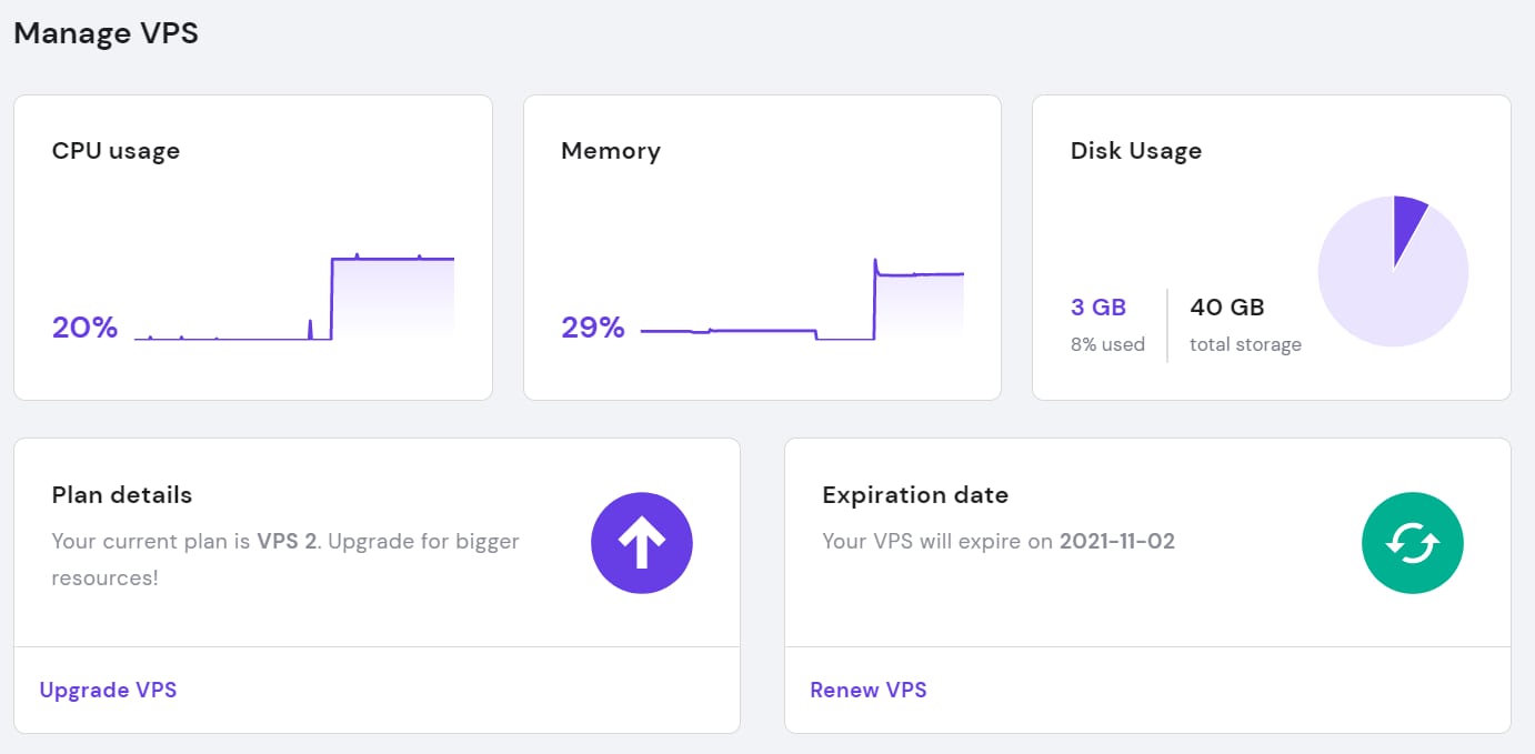 Sur cette page, vous pouvez voir une utilisation complète de votre VPS : utilisation du CPU, trafic entrant, nombre de processus, et bien plus encore.