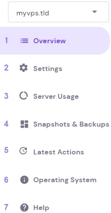 Une fois que vous avez sélectionné votre VPS, les sections suivantes s’affichent sur le côté gauche :