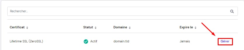 Pour cela, il suffit d’ouvrir SSL → Gérer: