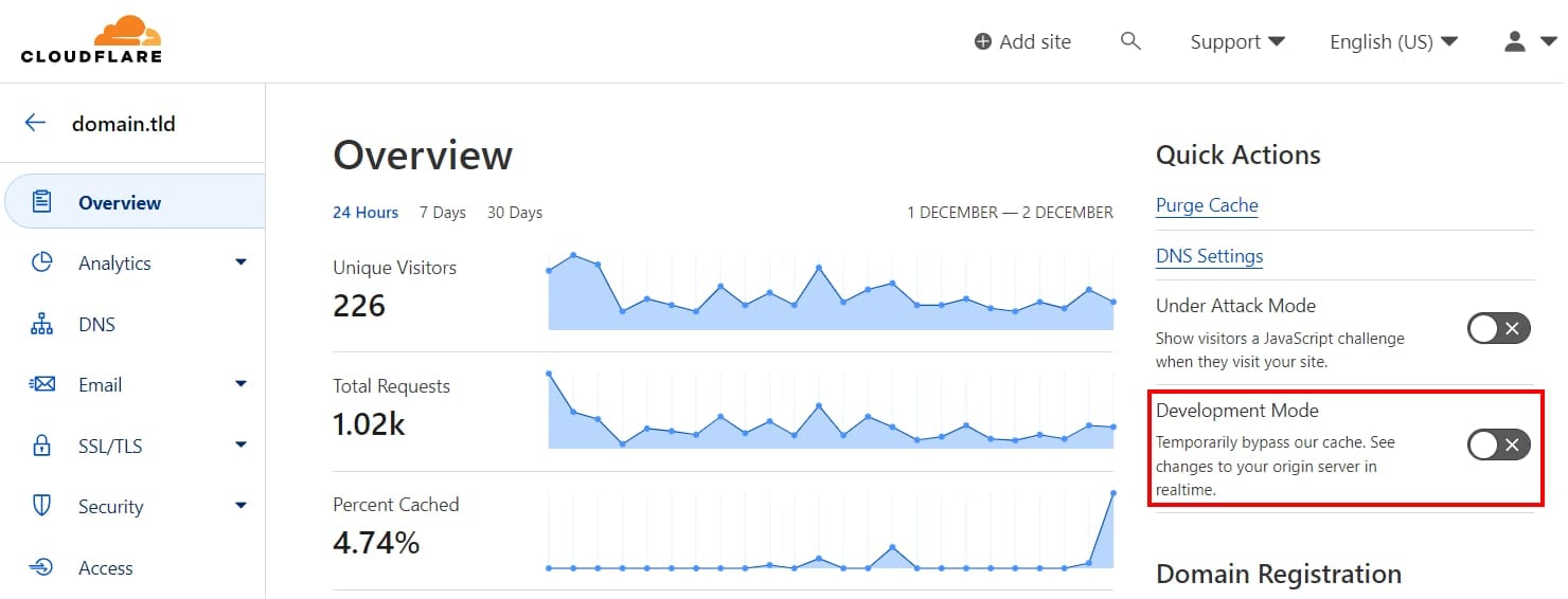 Pour contourner le cache de Cloudflare, vous pouvez utiliser le mode de développement. Il désactive la mise en cache pendant 3 heures, ce qui vous permet d’apporter des modifications à votre site et de voir comment il se comporte.