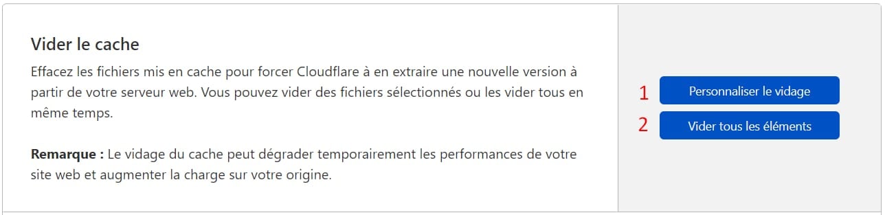 Si vous avez activé Cloudflare pour votre nom de domaine, vous pouvez purger le cache en vous connectant à votre tableau de bord Cloudflare, en choisissant le nom de domaine en question et en cliquant sur Vider le cache :