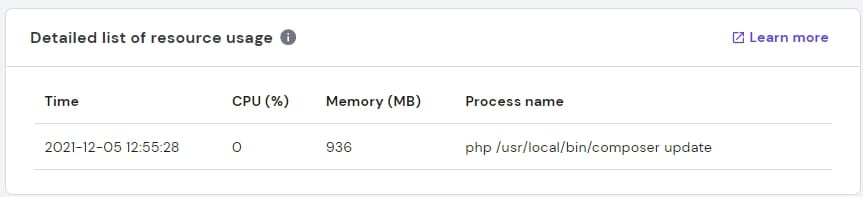 Si, après avoir exécuté les commandes du compositeur, vous voyez une erreur indiquant que la mémoire est épuisée, c’est une bonne indication que les limites ont été atteintes. Vous pouvez vérifier cela plus en détail en ouvrant la liste détaillée de l’utilisation des ressources et en trouvant la commande du compositeur en question :