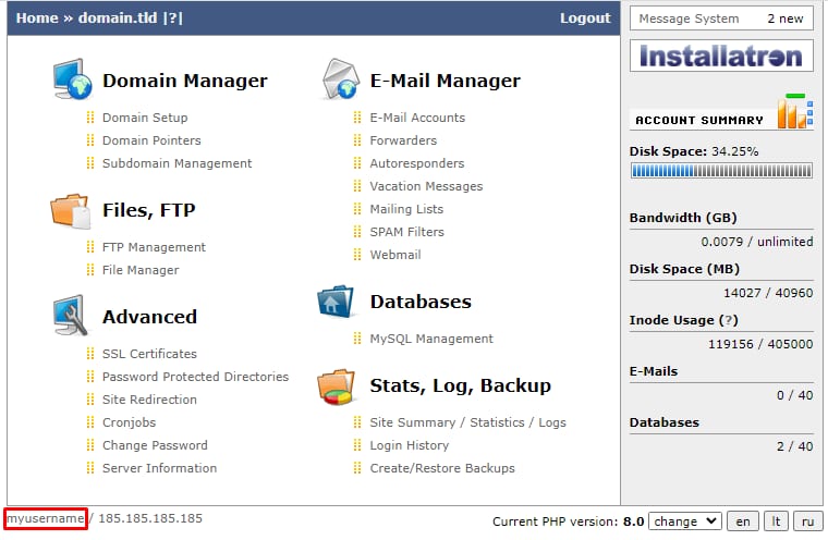 Gardez à l’esprit que la sauvegarde doit être renommée à votre nom d’utilisateur sur IV.LT, vous pouvez trouver le nom d’utilisateur dans le coin inférieur gauche du panneau de contrôle :