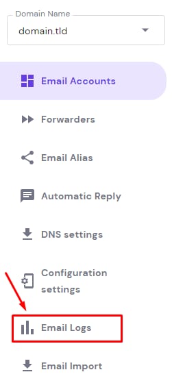 Vous pouvez l’ouvrir en accédant à l’un de vos comptes de messagerie Hostinger et en choisissant Journaux des Emails dans le menu latéral :