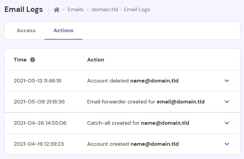 Grâce à la fonction Journaux d’action, vous pouvez facilement vérifier les actions effectuées avec vos comptes Hostinger Emails (par exemple la création de comptes de messagerie ou de redirections) et le moment exact où elles ont eu lieu.