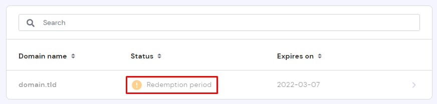 Selon le TLD du domaine, il peut entrer en période de grâce ou en période de rédemption . Vous pouvez trouver le statut en accédant au tableau de bord des domaines. S’il est en période de grâce, passez la souris sur ce statut affichera le temps restant avant que le domaine n’entre en période de rédemption :