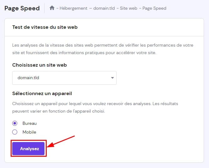Ensuite, choisissez le site web dans la liste déroulante, sélectionnez le type d’appareil et cliquez sur Analysez pour lancer le processus :