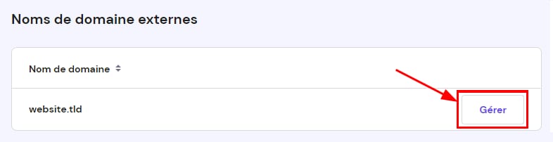 Allez dans la section Domaines sur la barre supérieure de hPanel et faites défiler jusqu’à la liste des Noms de domaine externes. Ensuite, cliquez sur Gérer à côté du domaine :