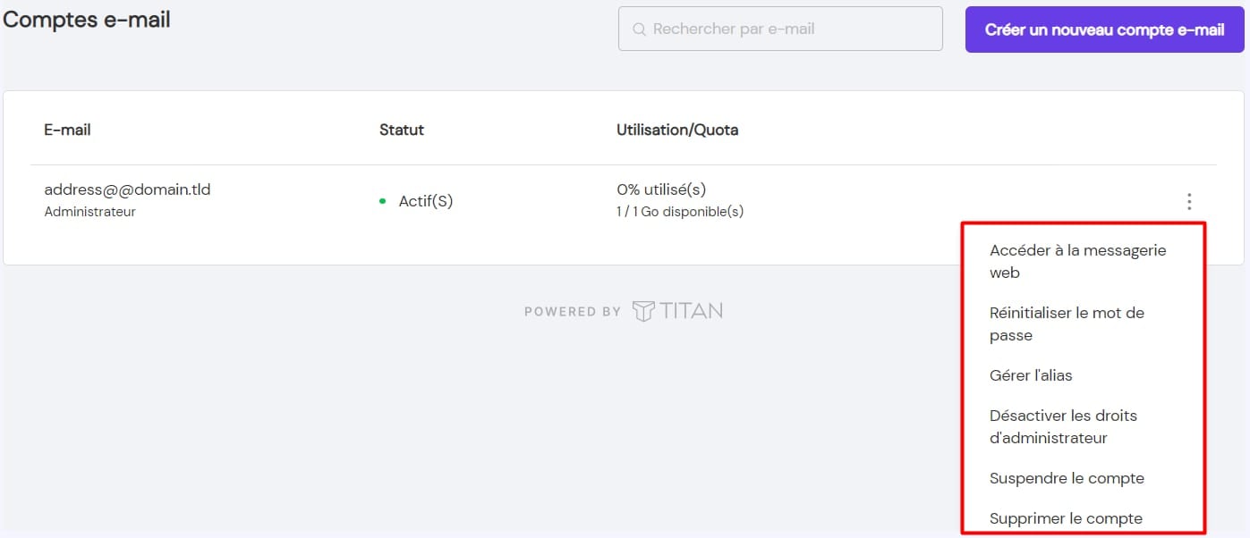 Vos comptes e-mail peuvent être facilement gérés à l’aide de la section Comptes e-mail, qui se trouve dans votre panneau de contrôle. Il suffit d’ouvrir E-mails → nom de domaine. Vous verrez la page Comptes Titan E-mail :