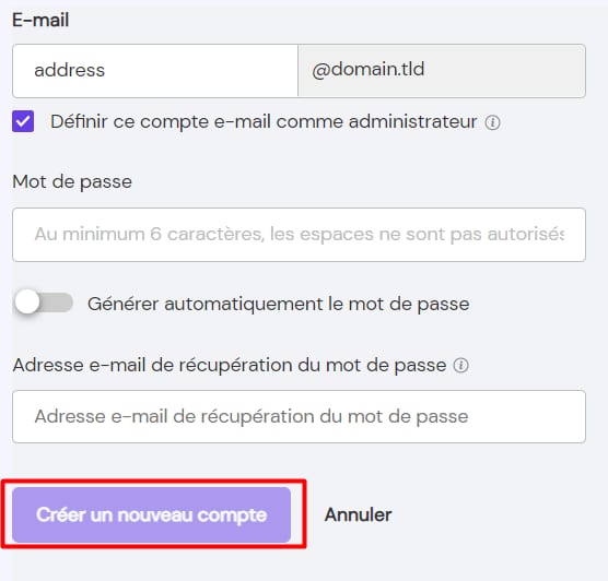 Insérez l’adresse e-mail et choisissez si vous voulez faire du compte un administrateur. Créez un mot de passe, ajoutez une adresse e-mail de récupération de mot de passe et cliquez sur Créer un nouveau compte :