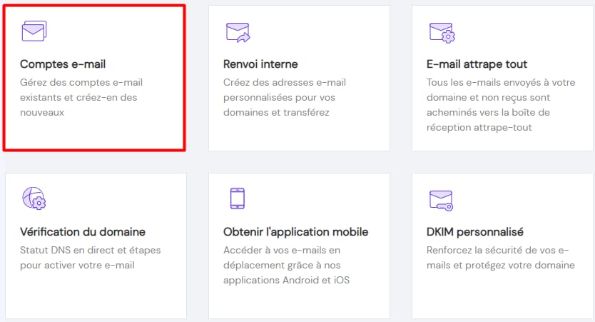 Vous pouvez toujours trouver un lien vers le Webmail dans votre hPanel : il suffit d’ouvrir E-mails → nom de domaine → Comptes e-mail :