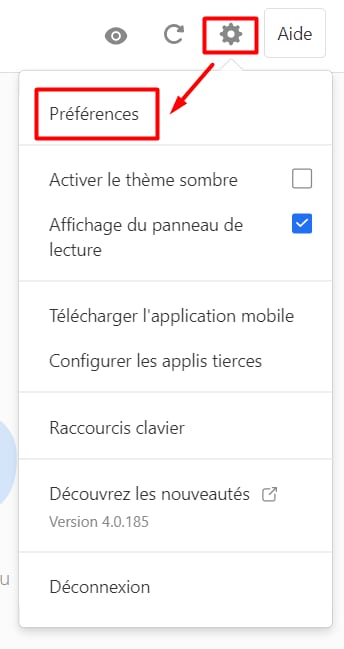 Vous pouvez créer une signature d’e-mail via le Webmail. Il vous suffit de vous connecter à votre interface Webmail, cliquez sur l’icône en haut à droite et choisissez Préférences :