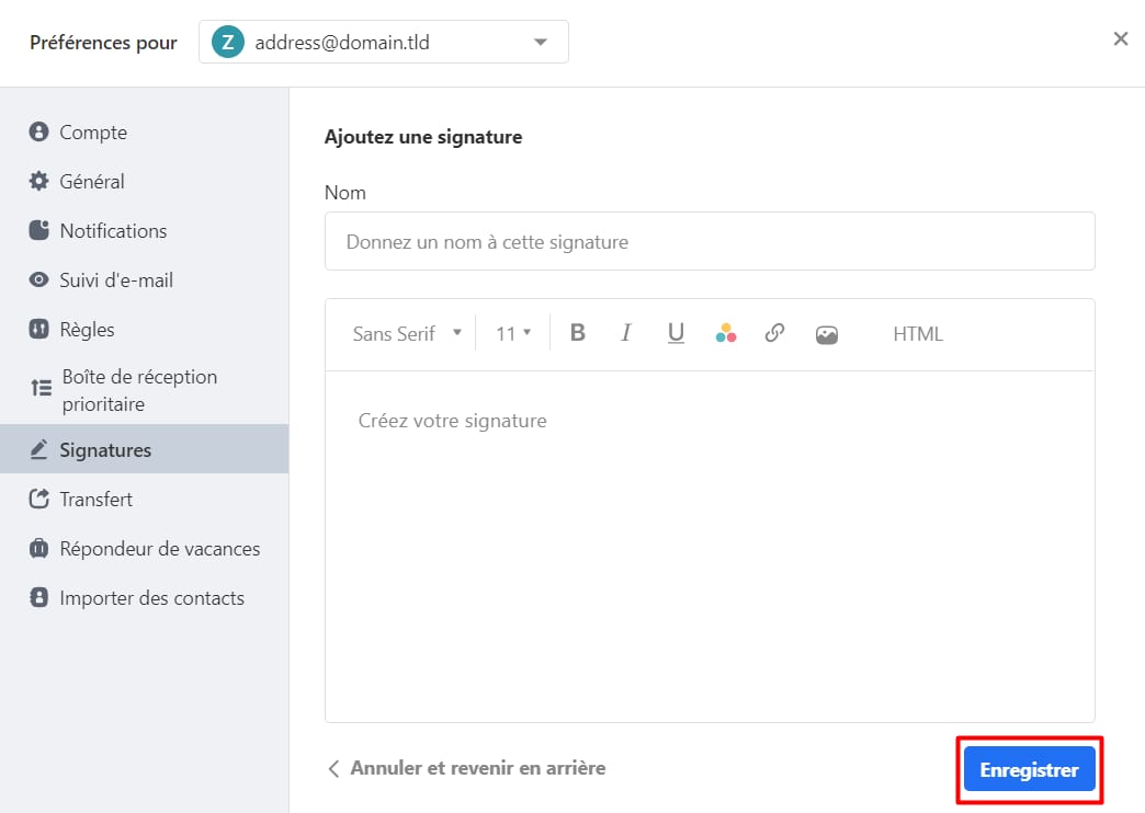 Cliquez sur Signatures, puis sur Ajouter une signature. Attribuez un nom à la signature et ajoutez le contenu. Une fois que tout est prêt, cliquez sur Enregistrer :