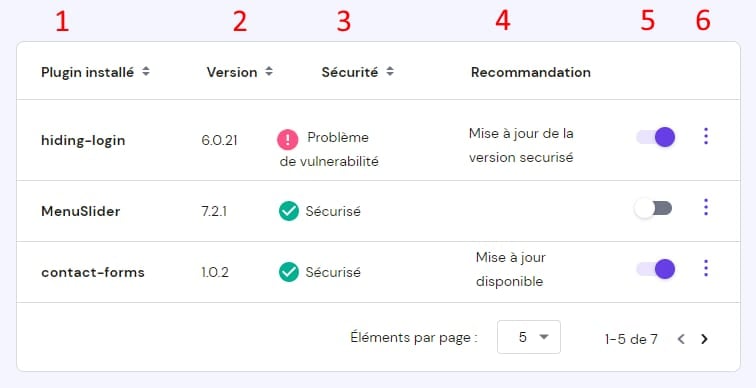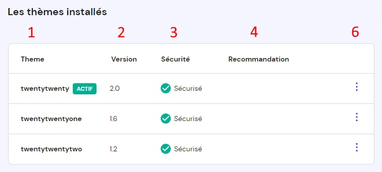 Sécurité – indique si un thème/Extension est sécurisée ou si une vulnérabilité a été détectée par Patchstack.