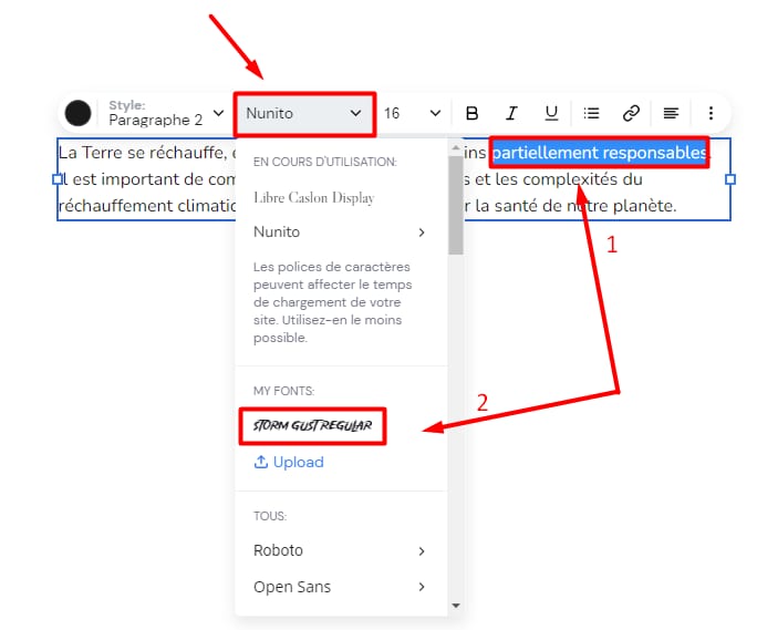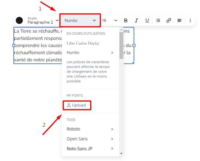 2. Développez la liste déroulante des polices, et sous Mes polices, cliquez sur Upload. Sélectionnez un fichier sur votre ordinateur pour le télécharger :