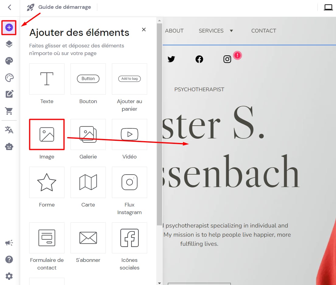 Pour ajouter des images à votre site Web, ouvrez l’éditeur et faites apparaître le panneau Ajouter des éléments sur la gauche. Sélectionnez l’élément image, puis faites-le glisser et déposez-le n’importe où sur votre site Web :