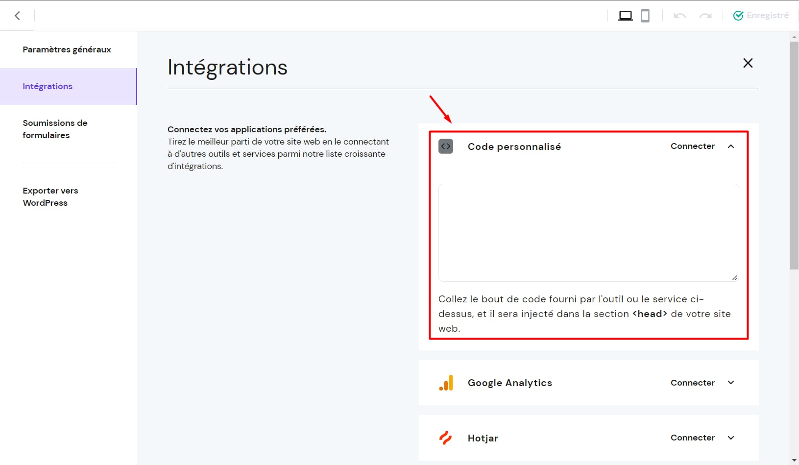 Dans le Créateur de sites web Hostinger, ouvrez les paramètres d’intégrations, puis trouvez le champ Code personnalisé :