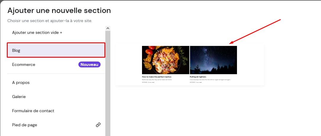 Dans le menu des sections, sélectionnez Blog et cliquez sur la vignette. Une section de blog sera insérée en dessous :