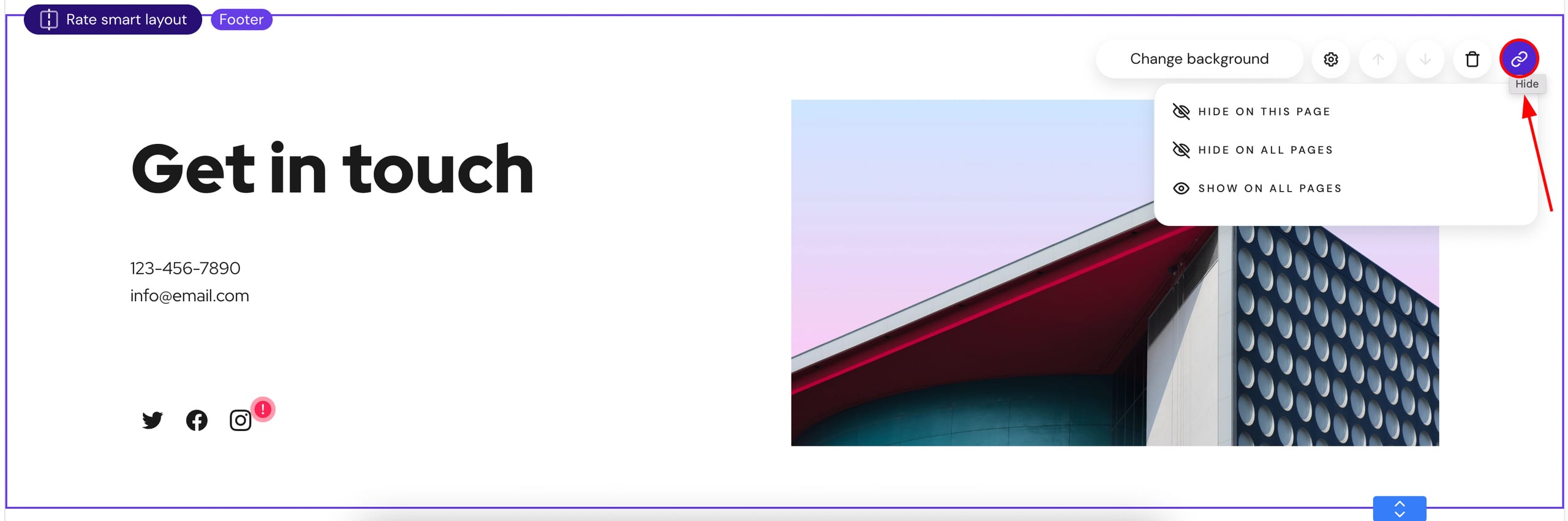 Si le pied de page est affiché sur toutes les pages du site web, vous pouvez facilement le masquer sur certaines d’entre elles. Il suffit de cliquer sur la section du pied de page, puis de cliquer sur le bouton Masquer, et de sélectionner Cacher sur cette page :