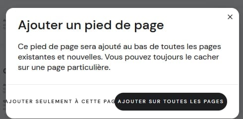 Nous vous recommandons de sélectionner l’option Ajouter à toutes les pages. De cette façon, le pied de page est épinglé au bas de votre site web, et vous pouvez le masquer manuellement sur certaines pages. Sinon, si vous sélectionnez l’option Ajouter à cette page, le pied de page sera inséré sous la section sélectionnée. Vous devrez peut-être déplacer le pied de page tout en bas manuellement :