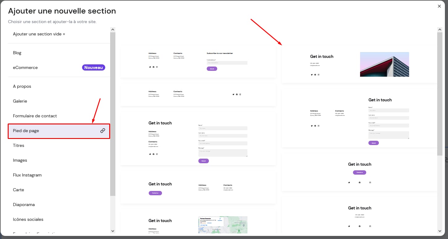 Remarque : si vous ne voyez pas ces options, il est probable qu’une section de pied de page est déjà insérée dans votre site web ; vous pouvez soit la supprimer et insérer un nouveau pied de page, soit modifier celui qui existe déjà.