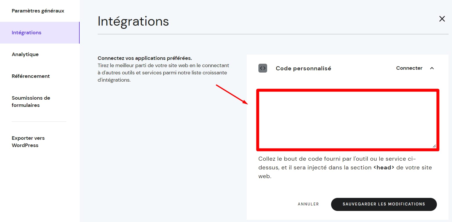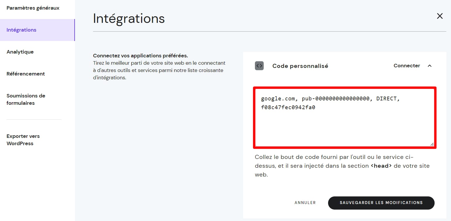 Dans le Créateur de sites Web Hostinger, accédez aux paramètres d’intégration et trouvez le champ Code personnalisé. Insérez-y votre code Google AdSense :