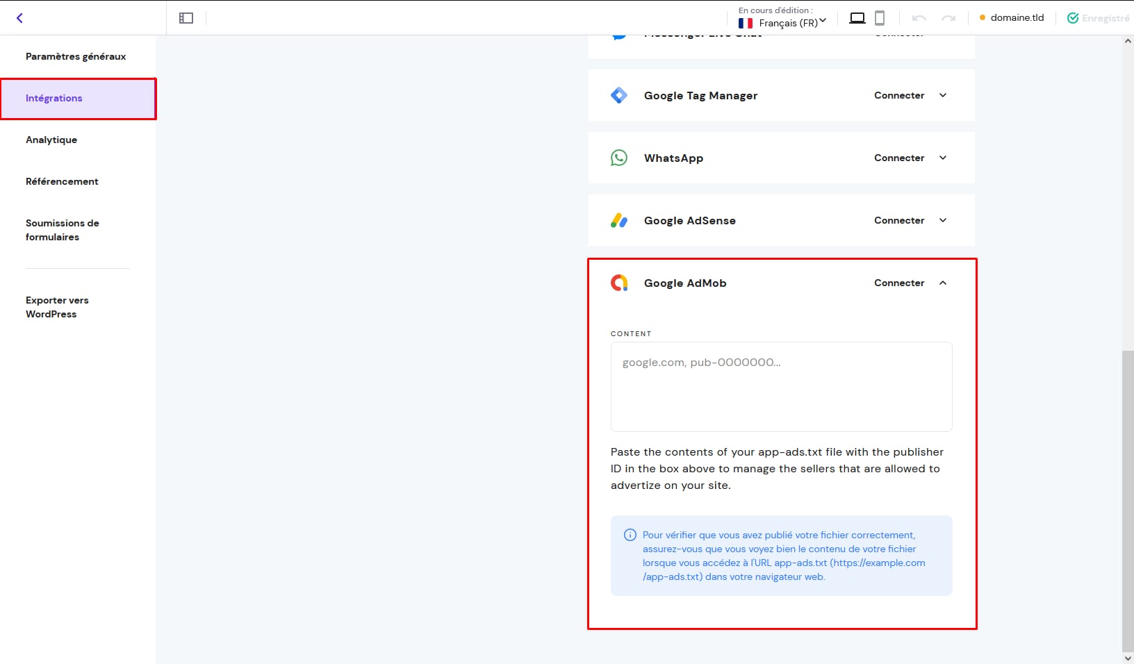 3. Ensuite, ouvrez les paramètres d’intégration de votre site web, trouvez le champ Google AdMob et collez-y le code :