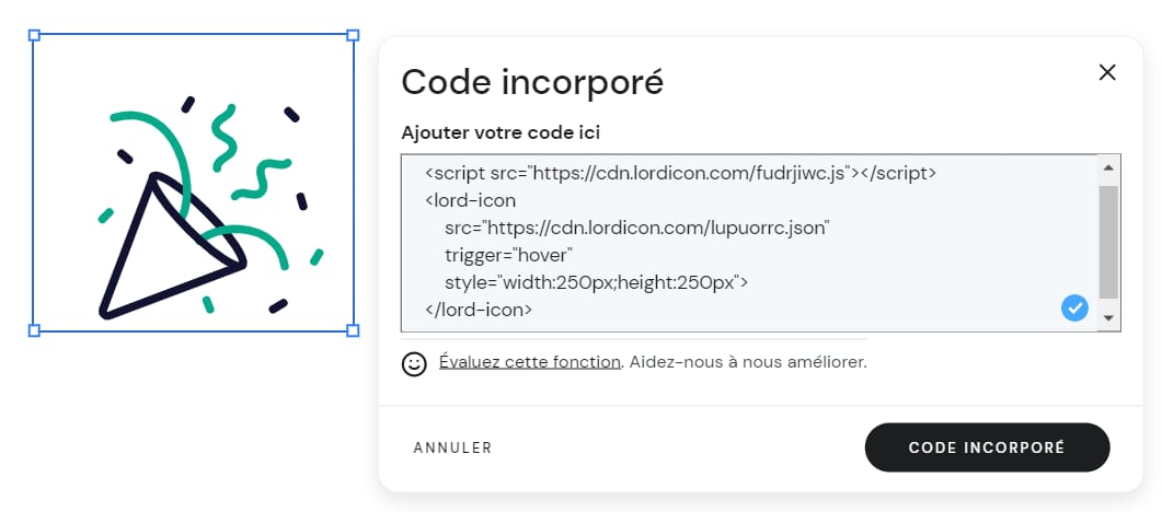 Vous pouvez intégrer des animations gratuites à votre site Web à l’aide d’outils tiers. Dans cet exemple, les animations Lordicon sont utilisées.