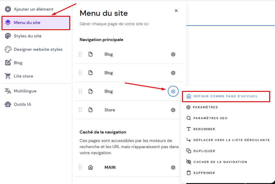 Dans le créateur, développez le panneau Menu du site sur la gauche, trouvez la page souhaitée, ouvrez ses paramètres et sélectionnez Définir comme page d’accueil :
