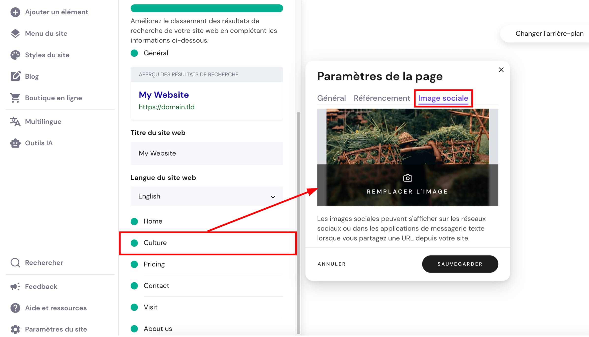 Dans les paramètres de référencement, vous pouvez télécharger des images d’aperçu individuelles pour chacune des pages de votre site Web. Dans les paramètres de référencement des pages, ouvrez l’onglet Image sociale, cliquez sur Ajouter une image ou Remplacer l’image et téléchargez votre fichier :