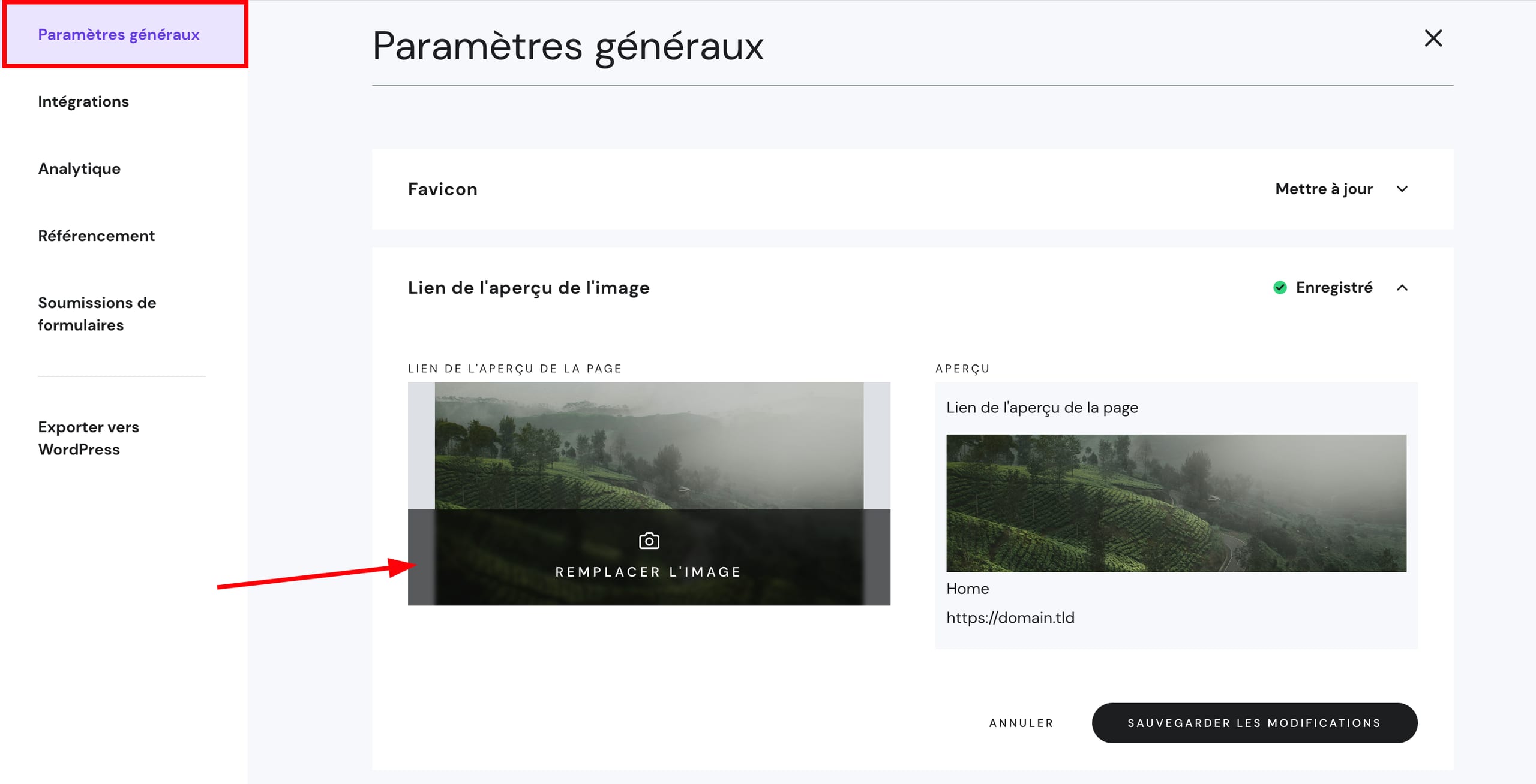 Dans les paramètres généraux du site Web, vous pouvez télécharger une image d’aperçu générale pour votre site Web. Cliquez sur Ajouter une image ou Remplacer l’image et téléchargez votre fichier :
