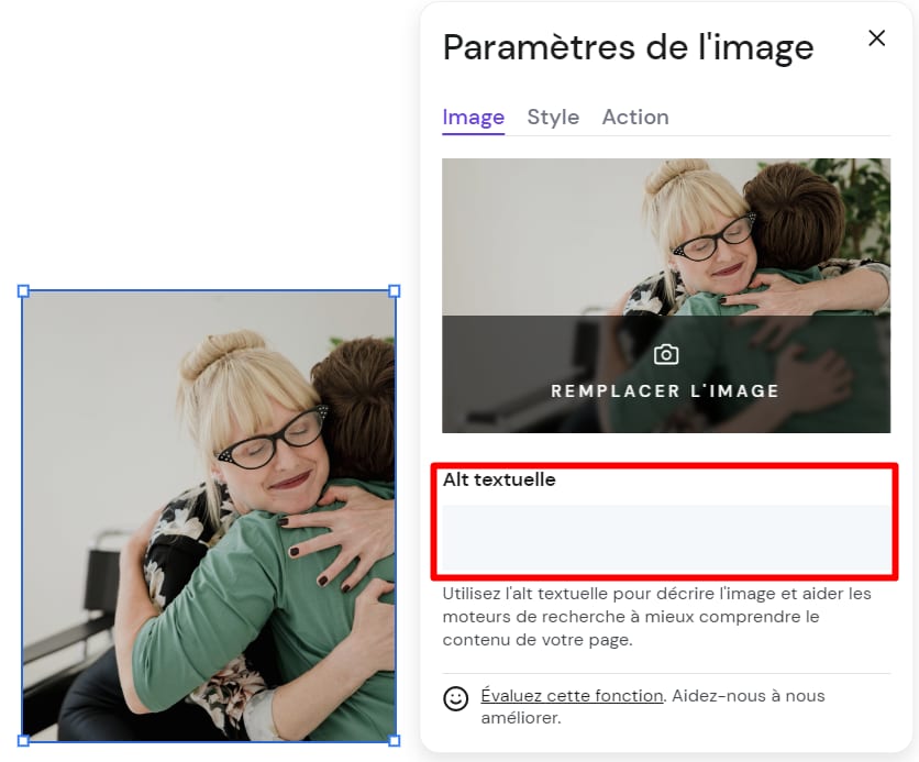Dans l’éditeur de votre site Web, cliquez sur l’élément d’image auquel vous souhaitez ajouter du texte alternatif, puis cliquez sur Modifier l’image. Dans les paramètres de l’image, trouvez le champ Alt textuelle et insérez-y une description de l’image :