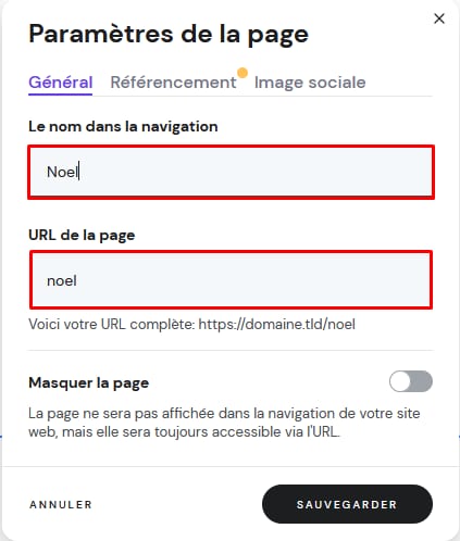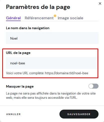 Lorsque vous ajoutez une nouvelle page à votre site web, son URL reproduit automatiquement le titre de la page. Si vous renommez la page, l’URL est également mise à jour automatiquement. Les symboles non latins sont remplacés par des symboles latins :