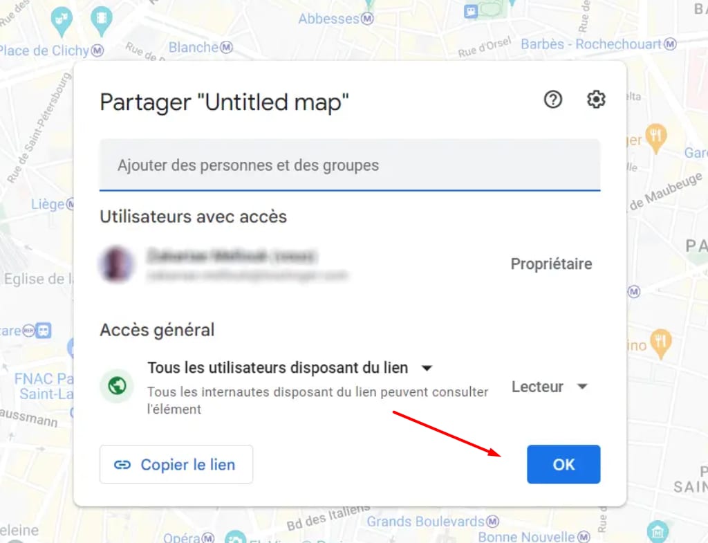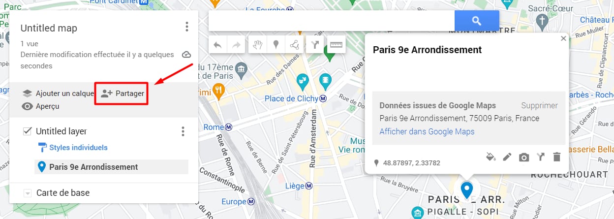 Une fois que vous avez créé votre carte, il est temps de l’intégrer à votre site Web. La première étape consiste à la rendre visible pour tous – cliquez sur Partager :