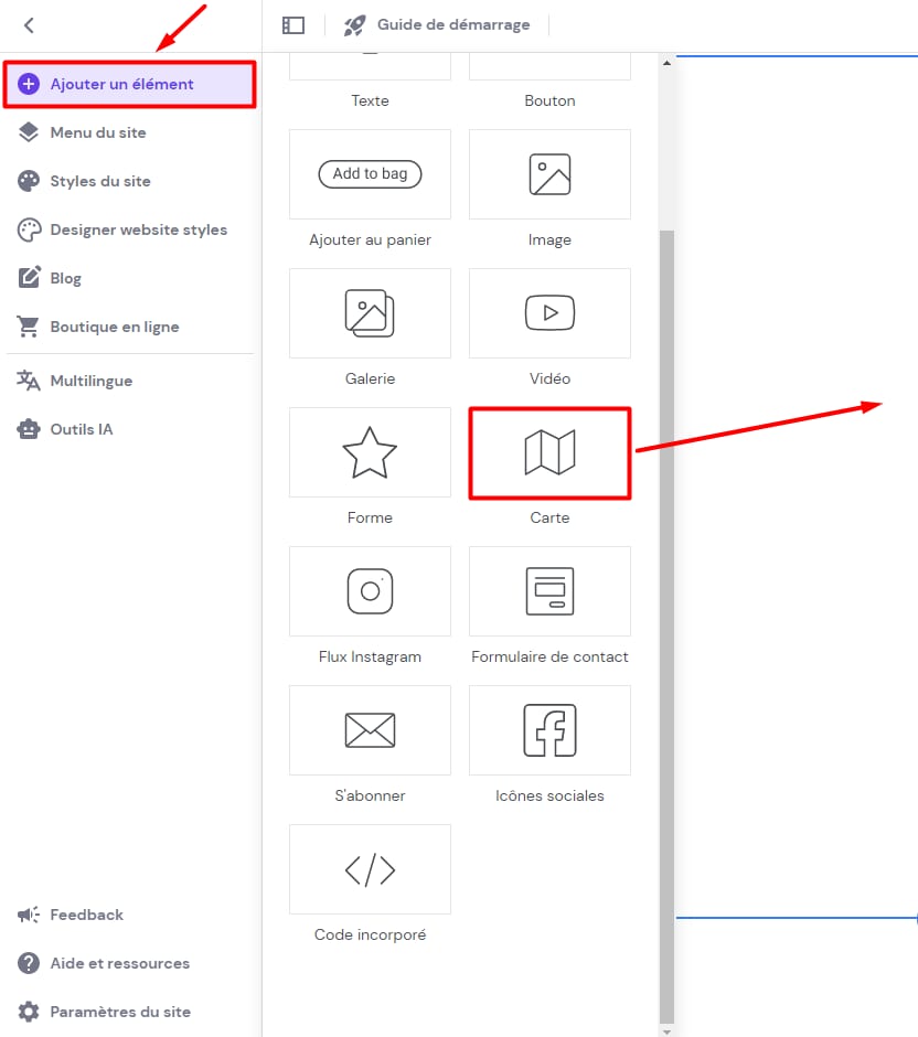 Dans l’éditeur, ouvrez le panneau Ajouter des éléments sur la gauche. Choisissez l’élément Carte et faites-le glisser à l’endroit souhaité sur votre site Web :
