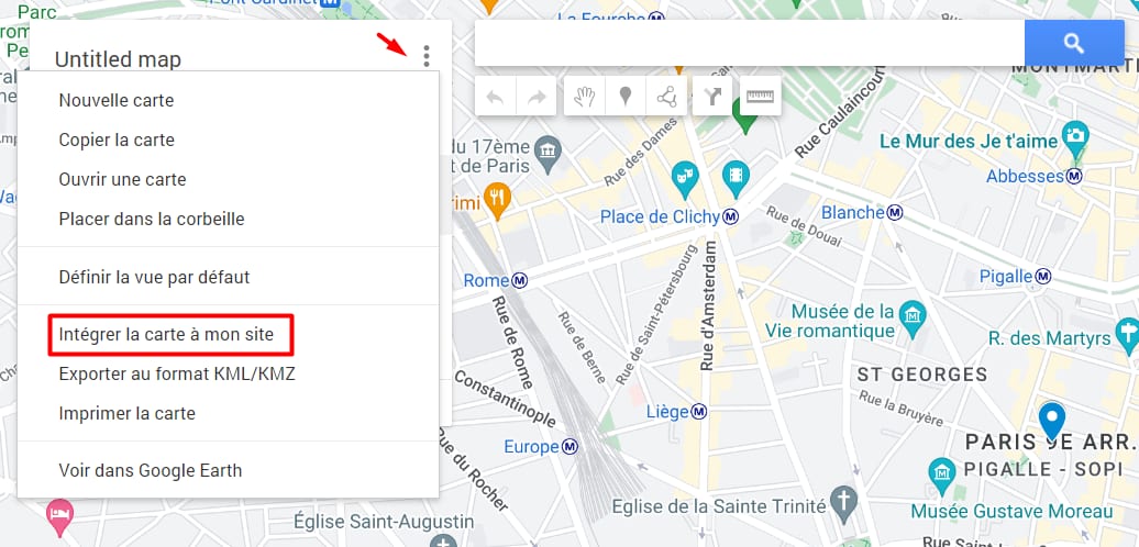 Maintenant, vous êtes prêt à obtenir un code. Cliquez sur le bouton ellipse ⋮ en haut de la fenêtre des paramètres, puis cliquez sur Intégrer la carte sur mon site :
