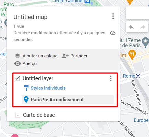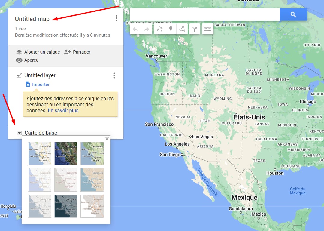 Ouvrez Google My Maps, puis cliquez sur Créer une nouvelle carte. Cliquez sur Carte sans titre, puis ajoutez le nom et la description de votre carte. Vous pouvez également choisir l’apparence de la carte en cliquant sur Carte de base :