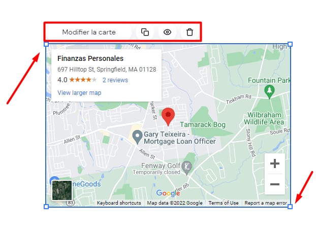 Cliquez sur Modifier la carte et insérez l’adresse souhaitée (vous pouvez simplement la copier depuis Google Maps).