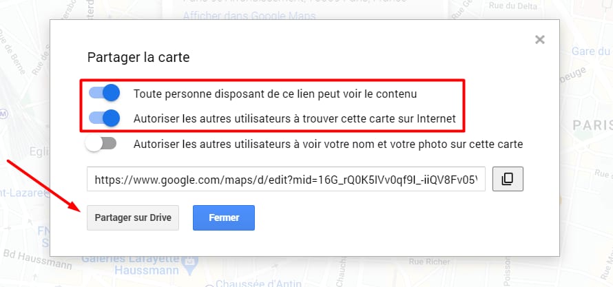 Basculez les options Toute personne disposant de ce lien peut voir et Laisser les autres chercher et trouver cette carte sur Internet. Cliquez sur Partager sur Drive :
